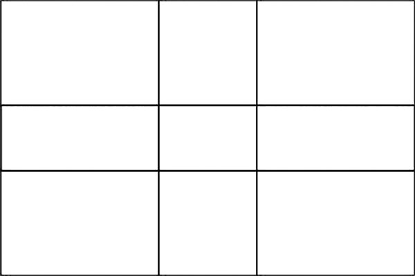 Pierwszy rysunek przedstawia w jaki sposób podzielić kadr, który najczęściej jest prostokątem, na dziewięć pól, przy pomocy poziomych i pionowych linii na wysokości (szerokości) 1/3 i 2/3.