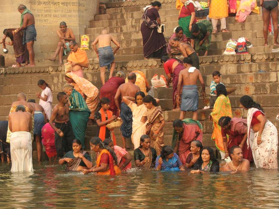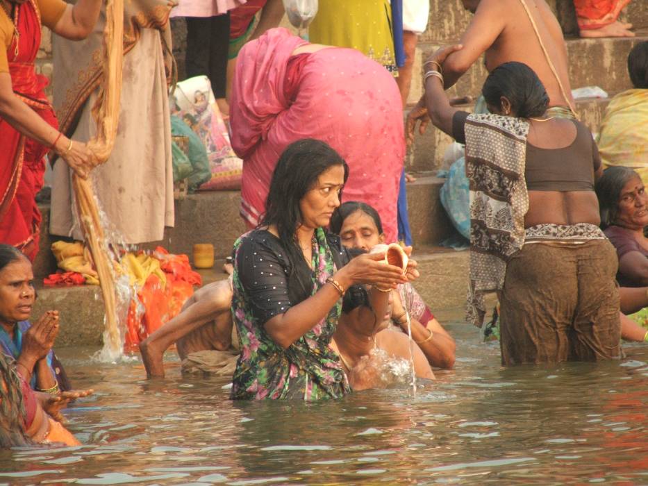 Rozlegają się modlitwy, po czym wierni dalej szepcząc święte teksty, wolno zanurzają się do pasa w wodzie. Następnie kilkakrotnie moczą głowę. Po obowiązkowych modłach następuje dokładne szorowanie całego ciała. Wody Gangesu zapewniają bowiem wyznawcom hinduizmu głębokie mistyczne doznania a święta rzeka zmywa brud ciała i ducha. Zanurzenie się w niej, jest tym samym co ponowne czyste i wolne od grzechu narodziny.